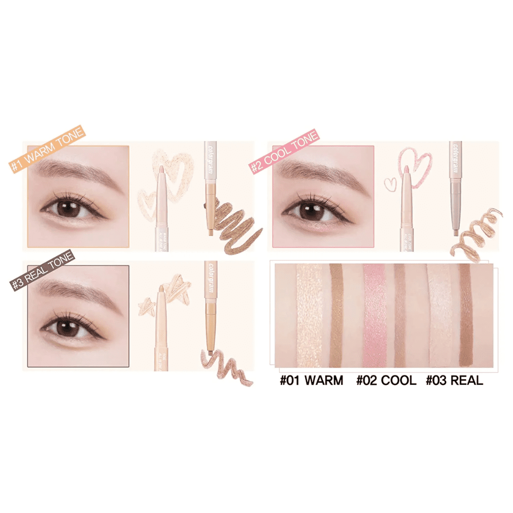 Modo de uso: Dibujar una línea suave debajo del ojo con el lado de sombra para crear profundidad. Luego, aplicar el lado iluminador sobre el área del aegyo-sal para aportar volumen y brillo. Difuminar ligeramente para un acabado natural.