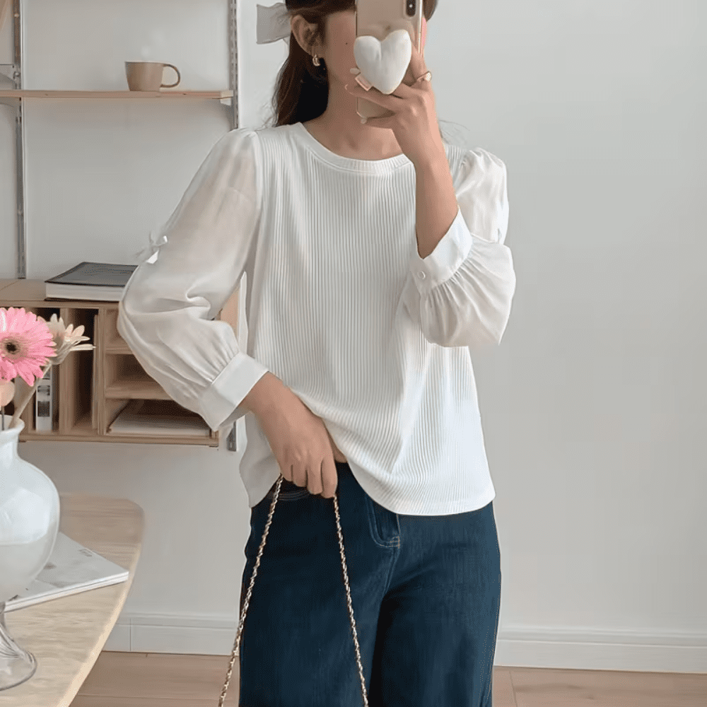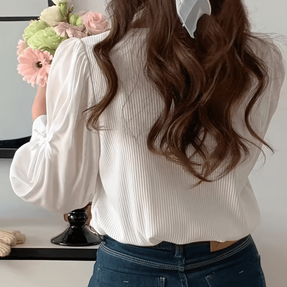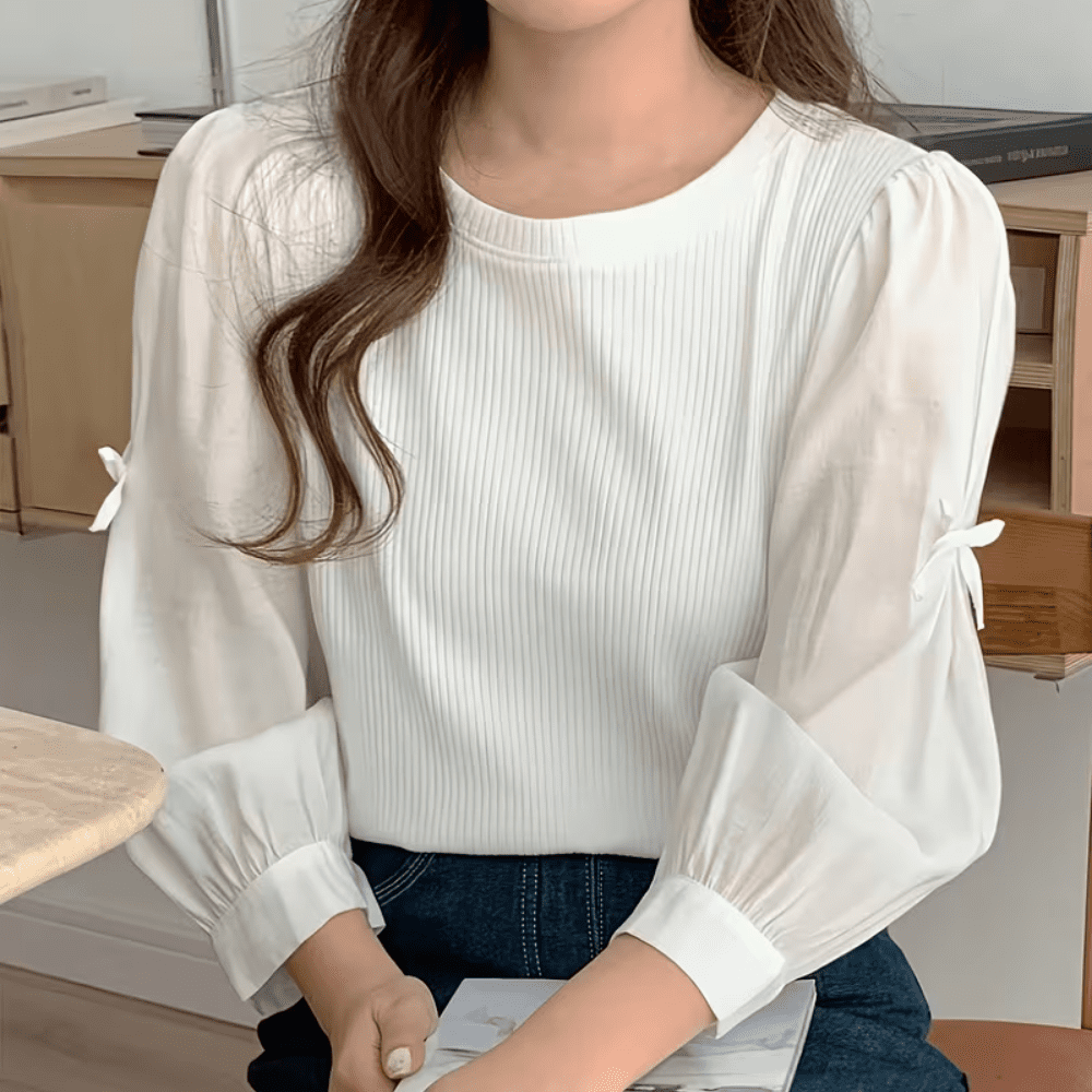 CAMISA DE MUJER DE UNICOLOR CON CUELLO REDONDO, MANGA LARGA Y DECORACIÓN DE LAZO, ELEGANTE.