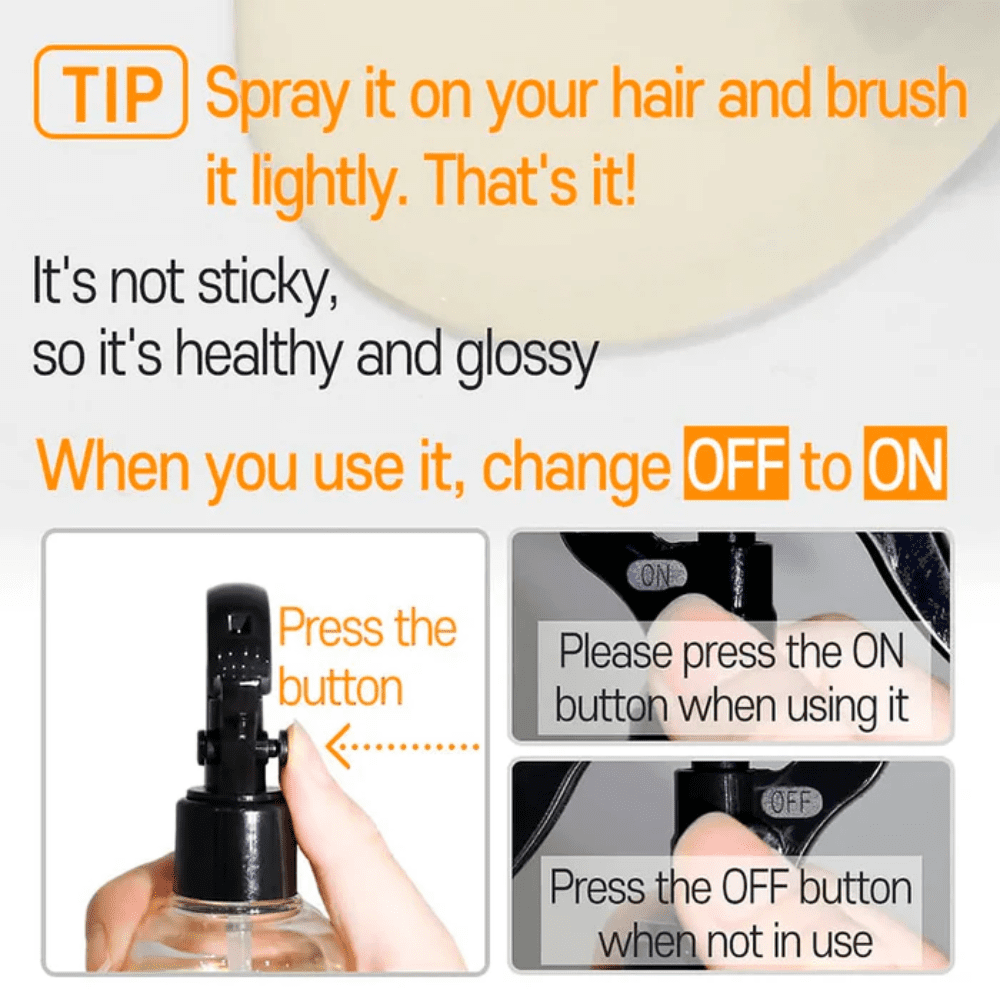 Rociar una cantidad adecuada sobre el cabello húmedo o seco a una distancia moderada.