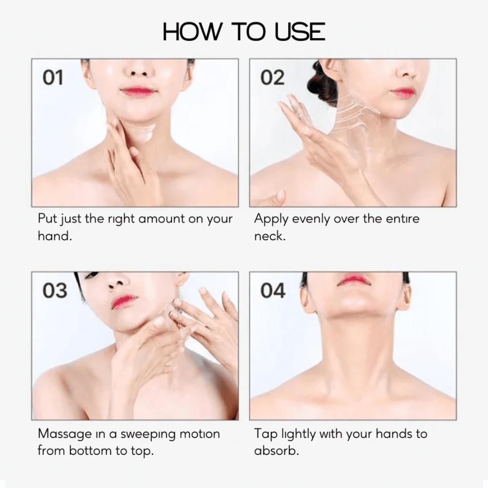 Modo de uso: Aplicar una cantidad adecuada sobre el cuello y escote, con la piel limpia. Masajear con movimientos ascendentes hasta su completa absorción.