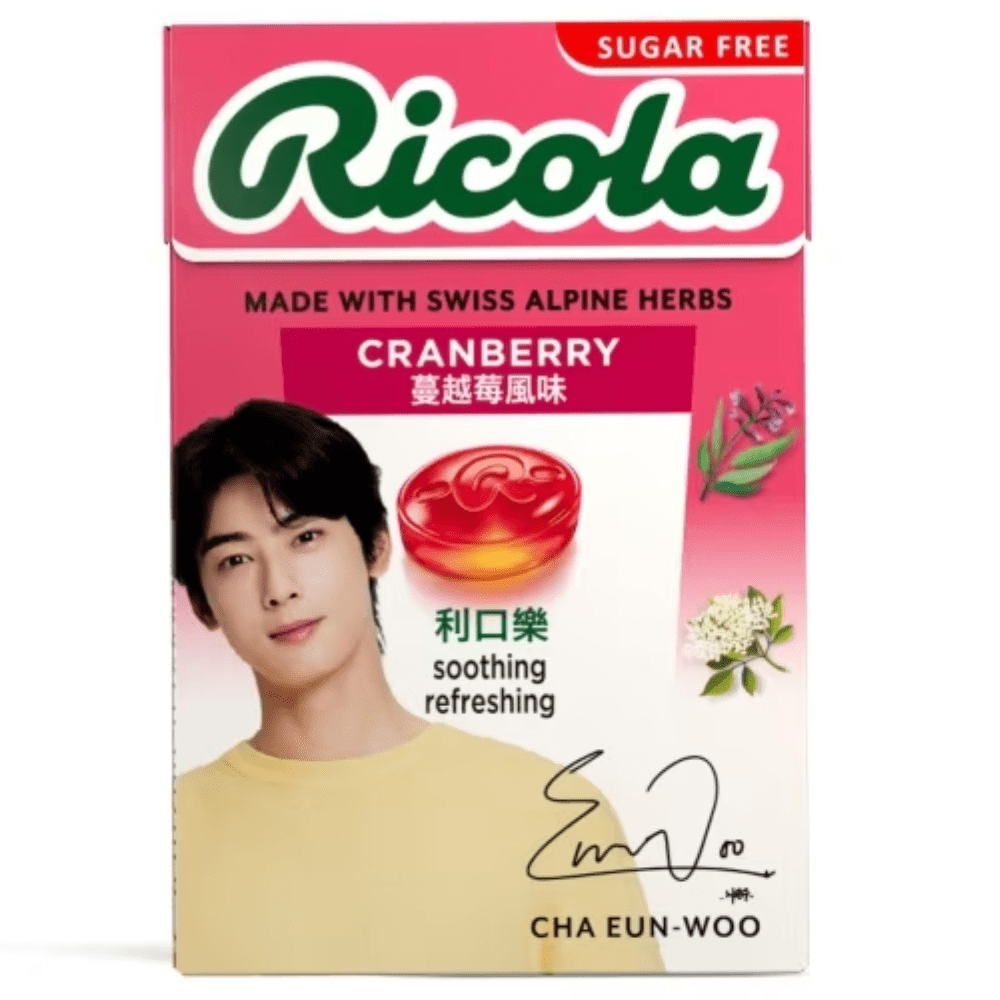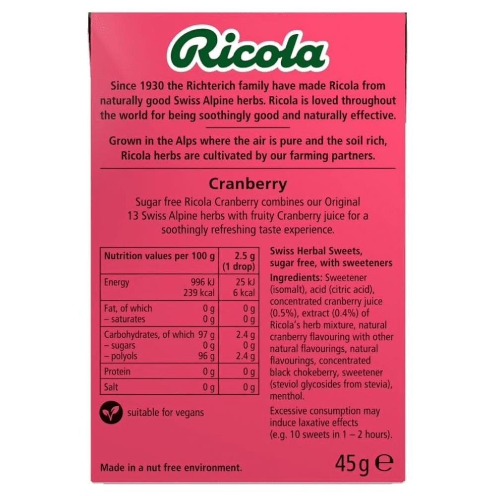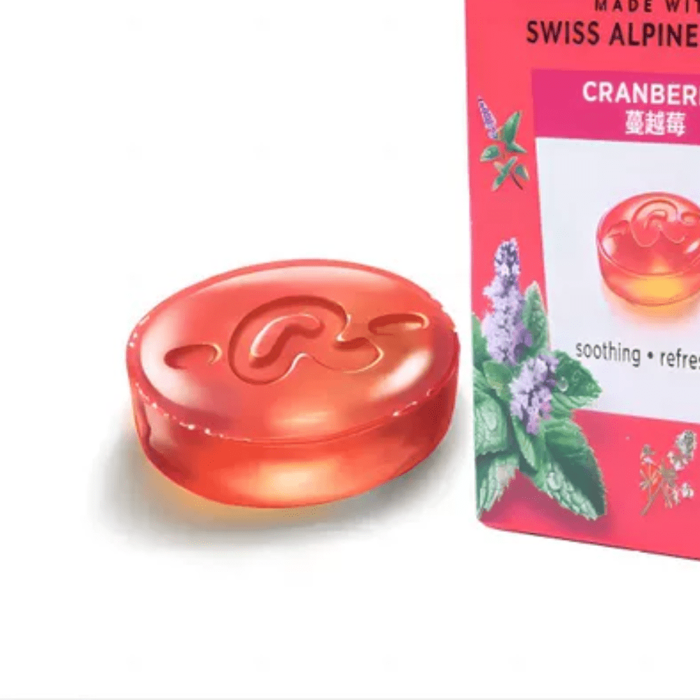 Ingredientes: Sugar, Glucose Syrup, Cranberry Juice Concentrate, Herbal Extract Blend (Menthol, Peppermint, Thyme, Sage, Elderflower), Natural Flavoring, Citric Acid