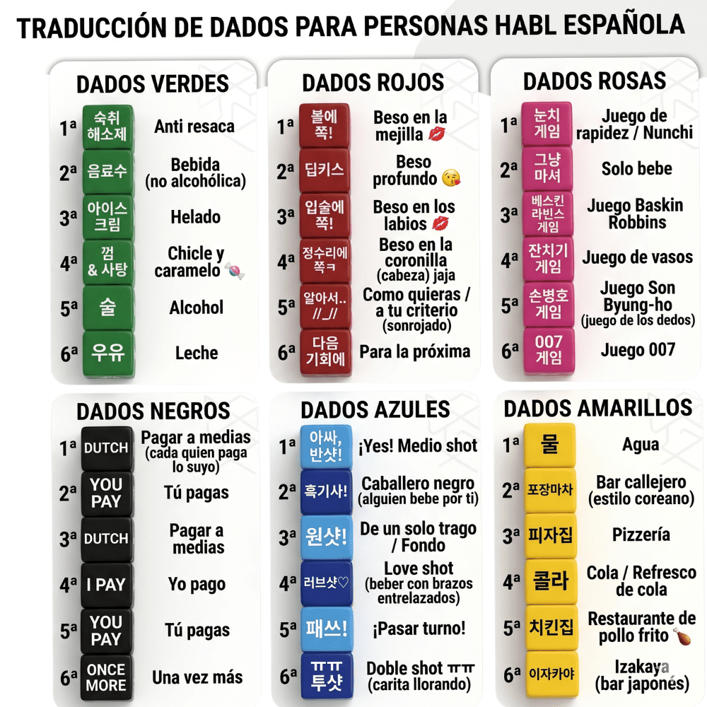 Modo de uso: Lanzar los dados y seguir las indicaciones o retos que aparezcan en cada cara durante el juego.