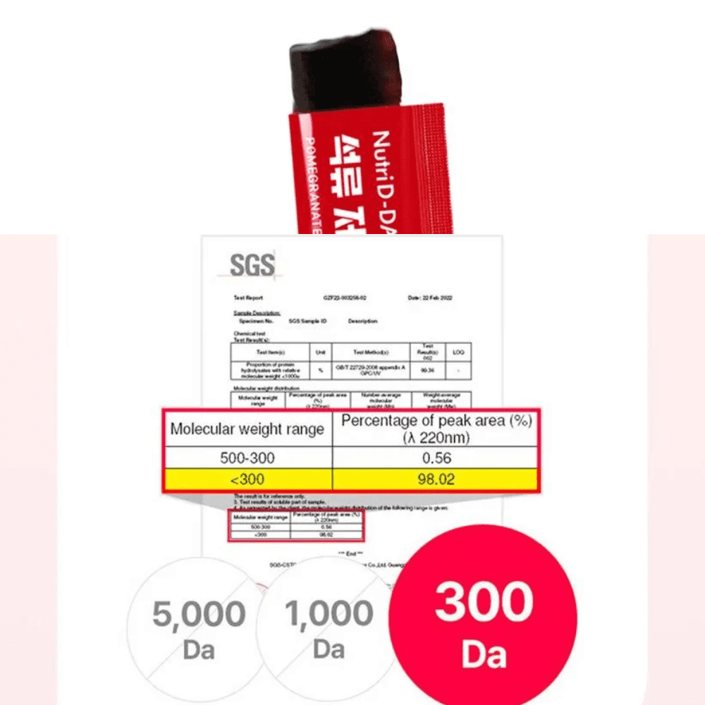 Ingredientes: Collagen Peptides (Ultra Low Molecular), Pomegranate Extract, Vitamin C, Hyaluronic Acid, Citric Acid, Flavoring, Stevia, Maltodextrin