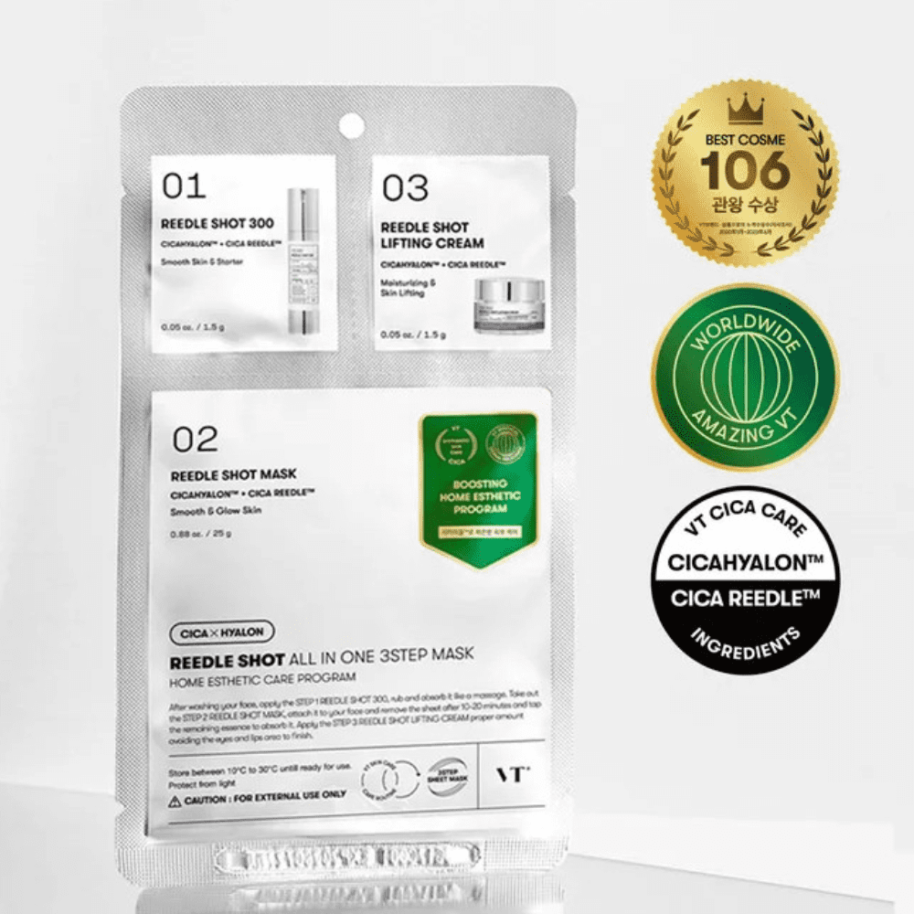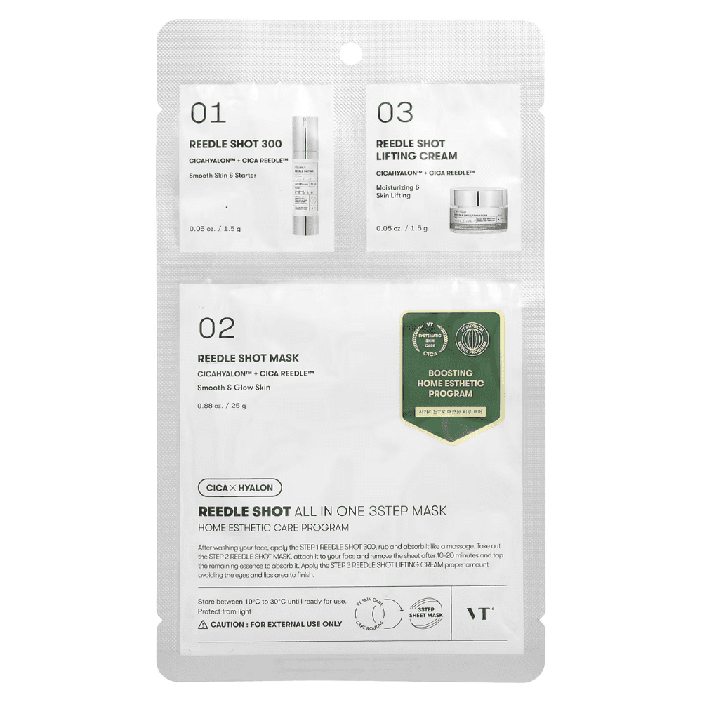 Modo de uso: Aplicar el Step 1 (Reedle Shot ampoule) sobre la piel limpia y seca, masajear suavemente hasta su absorción. Luego aplicar la mascarilla (Step 2) durante 10 a 20 minutos. Finalmente, aplicar el Step 3 (esencia/crema) para sellar la hidratación.