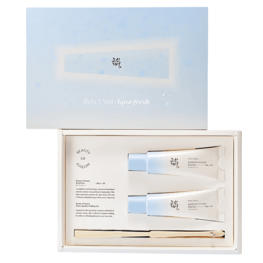 Kit de protector solar coreano que combina dos fórmulas con SPF50+ PA++++ para ofrecer alta protección contra rayos UVA y UVB mientras cuida la piel. Incluye Relief Sun Aqua-Fresh, ideal para una hidratación ligera y acabado fresco, y Rice + B5 Sunscreen, que ayuda a nutrir, iluminar y fortalecer la barrera cutánea. Este dúo es perfecto para proteger, hidratar y mejorar la apariencia de la piel diariamente.
