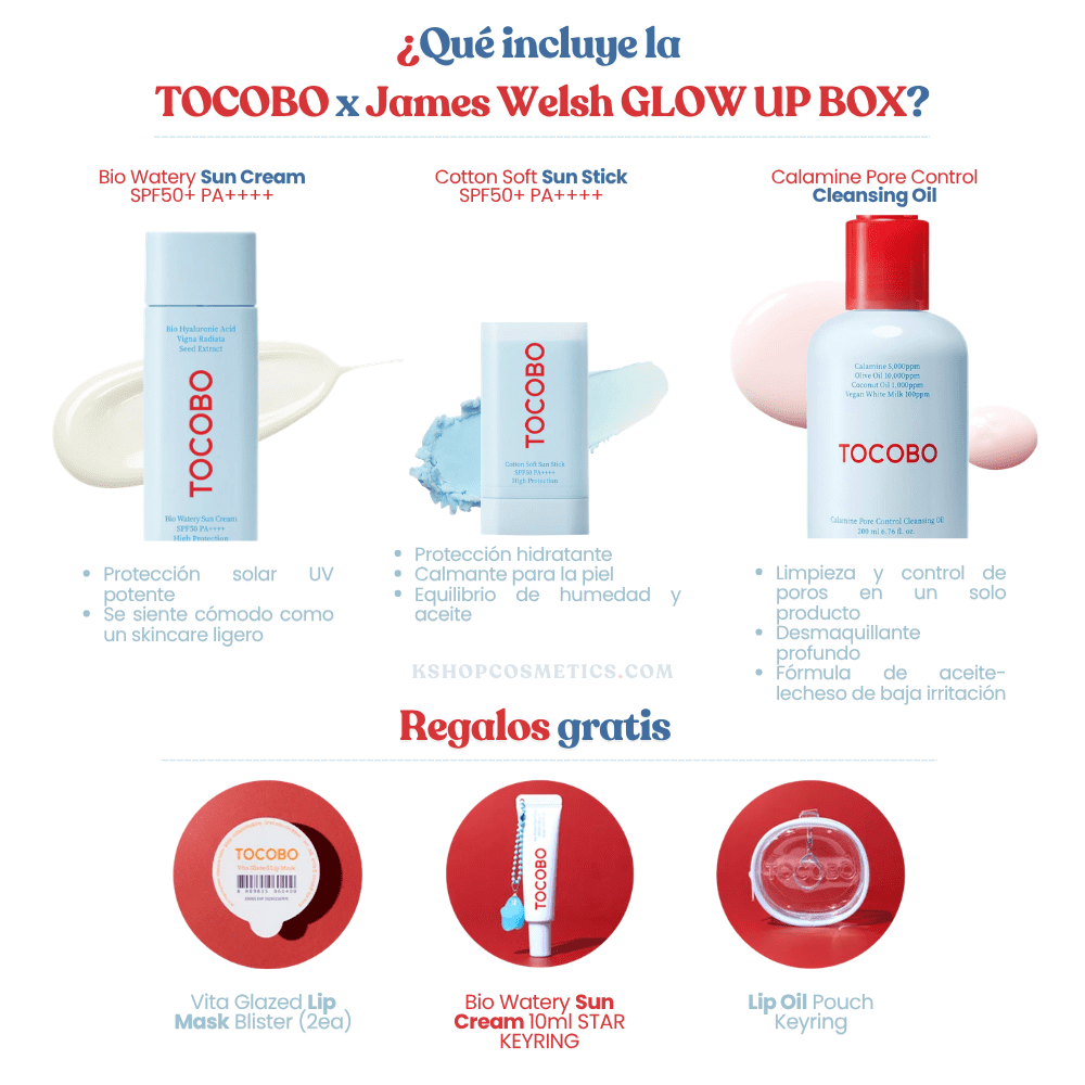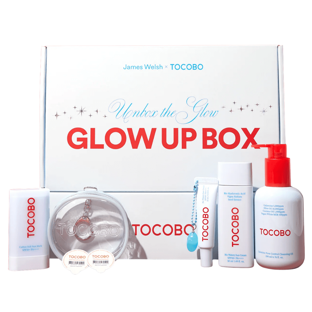 Kit exclusivo de skincare coreano en colaboración con James Welsh x TOCOBO, diseñado para lograr una piel hidratada, luminosa y saludable tipo glass skin. Incluye una rutina completa enfocada en exfoliar suavemente, hidratar, fortalecer la barrera cutánea y proteger la piel. Ideal para quienes buscan mejorar la textura, luminosidad y mantener un glow natural durante el día.